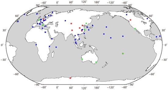 Tracking stations in precise-orbit determination and satellite laser ranging (SLR) validation for BeiDou-2 and BeiDou-3 satellites. The stations are represented by red five-pointed stars, blue circles, and green diamonds for iGMAS, Multi-GNSS Experiment (MGEX), and SLR stations, respectively.
