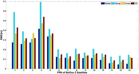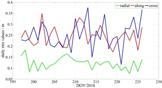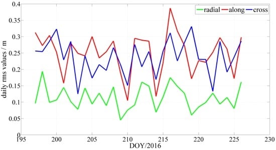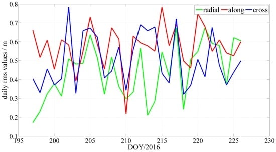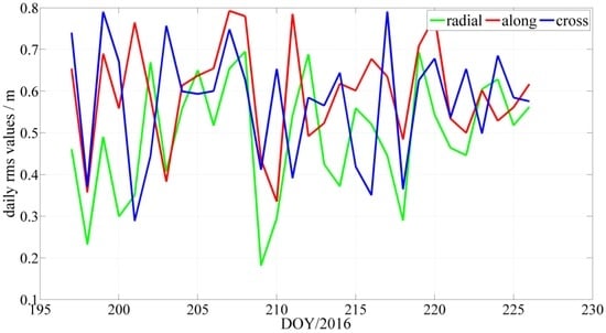 The average daily root mean square (RMS) values of the 24-h overlap in the radial, along, and cross-track components for each satellite are shown in Table 4 and Figure 3, Figure 4, Figure 5, Figure 6 and Figure 7. The RMS values for the along component for all BeiDou satellites are the largest among the three components, whereas the radial component has the smallest RMS values. Furthermore, BeiDou-3 MEO satellites (C33 and C34) have larger RMS values than the BeiDou-3 IGSO satellites (C31 and C32), whereas BeiDou-2 MEO satellites have smaller RMS values than the BeiDou-2 IGSO satellites. Furthermore, BeiDou-3 IGSO and BeiDou-2 IGSO satellites have identical RMS values, whereas BeiDou-3 MEO satellites have larger RMS values than the BeiDou-2 MEO satellites. In addition, BeiDou-2 GEO satellites yield significantly large RMS values among all of the BeiDou-2 satellites. BeiDou-3 MEO satellites have inferior POD accuracy compared with BeiDou-2 MEO satellites because the existing tracking network for BeiDou-3 MEO satellites is not well distributed worldwide, which implies that the tracking network does not have a good coverage for global MEO satellites, whereas the regional IGSO satellites are relatively better observed. In addition, the RMS residuals are approximately 10 cm and 25 cm in the radial and along components for BeiDou-3 IGSO satellites, respectively. For BeiDou-3 MEO satellites, the RMS residuals are approximately 40 cm and 60 cm in the radial and along components, respectively. The RMS residuals are approximately 10 cm and 20 cm in the radial and along components for BeiDou-2 IGSO satellites, respectively. For BeiDou-2 MEO satellites, the RMS residuals are approximately 5 cm and 15 cm in the radial and along components, respectively.