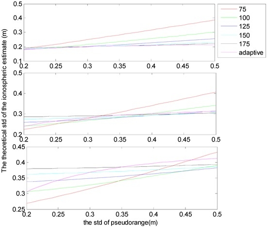 The theoretical standard deviations (std) of the DD ionospheric delay estimates versus the std of the pseudorange observations; the std of the phase observation is 2 mm (top); 3 mm (middle) and 4 mm (bottom). “Adaptive” represents the estimation where the ratio satisfies the real value, and the other lines with different colours represent estimations when the ratios are constants (75, 100, 125, 150, and 175).