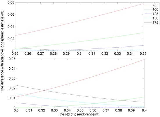 As we all know, the standard deviation (std) of phase observables mainly range from 0.2 mm to 0.3 mm. When the phase noise is around 0.3 mm, the corresponding std of pseudorange observable often limits from 0.3 m to 0.4 m. For the above-mentioned conditions, Figure 2 presents the corresponding differences between ionospheric estimates and adaptive estimates. It can be seen from Figure 2, the estimates from the ratio of 125 is almost the closest to that from the adaptive estimates. Although there are two exceptions: in the top panel, when pseudorange noise ranges from 0.3 m to 0.35 m, the difference between ionospheric estimated from the ratio of 125 is larger than that from the ratio of 150; and, in the bottom panel, when pseudorange noise range from 0.3 m to 0.35 m, the difference between ionospheric estimated from the ratio of 125 is larger than that from the ratio of 100. However, for these two exceptional conditions, the maximum difference is only 0.7 mm, which happens at the top panel when the pseudorange is 0.35 m. Thus, the deviation is not obvious, and the ionospheric estimates from ratio of 125 is still can be believed has the optimum performance.