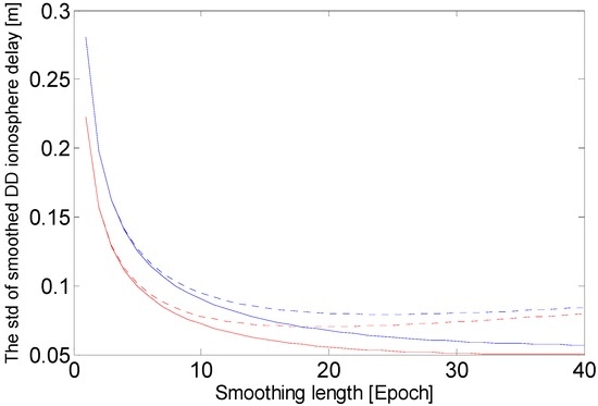 Considering higher-order ionosphere effects and combination noise, the standard deviation of ionosphere will generally range from 0.01 to 0.02 m [24,25]. In Figure 3, given the same smoothing length, the precision of ionospheric delay estimates from the new method is always better than that from the current ionospheric combination method. When the standard deviation of ionospheric is 0.02 m, the precision of ionospheric from the new method initially improves as the smoothing length increases, reaching an optimal smoothing length at 16 epochs, and then the standard deviation increases as the length increases. If ionospheric has a standard deviation of 0.01 m, the new method obtains ionospheric with nearly the same standard deviation when the smoothing length is equal to or more than 16 epochs. With the new method, when Equation (10) is used to estimate ionospheric, the smoothing window should updates instantaneously, and the maximum smoothing length could be set to 16 epochs.