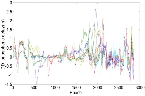 Figure 4 shows DD ionospheric estimates using the post-processing method. It can be observed that the ionospheric exhibits large daily variations, and its effect cannot be eliminated by double differencing operation.