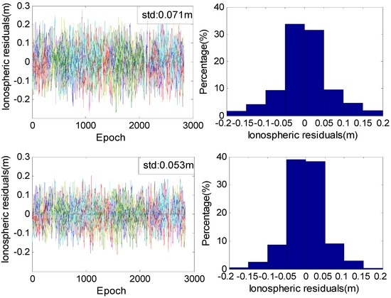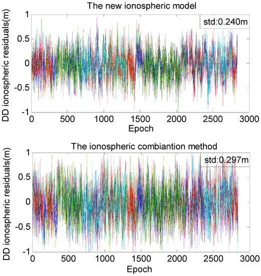 Figure 5 demonstrates the performances of the two ionospheric models. The standard deviation of the ionospheric delays estimated from the new method is 20% less than that from the combination method.
