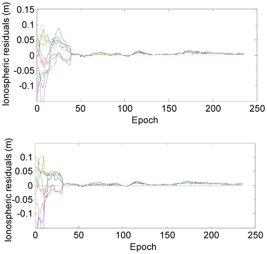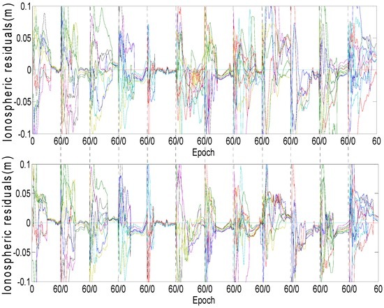 In Equation (10), if the two WL ambiguities are not correctly determined, the ionospheric estimates from Equation (7) will be seriously deteriorated, which thus affects the current estimate and the 15 subsequent epochs’ ionospheric estimates from Equation (10). Although this phenomenon is rare, we use the following test to avoid it:
