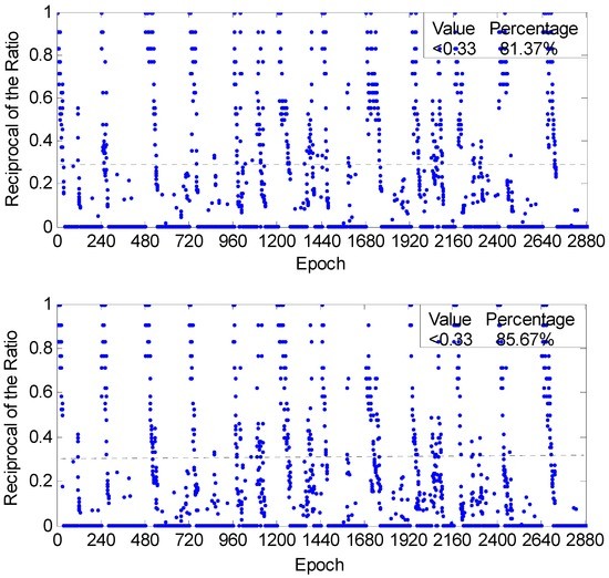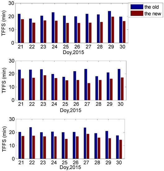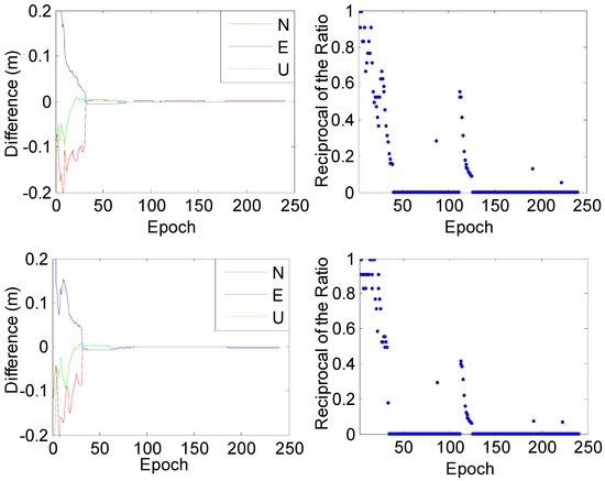 Figure 11 reflects the overall ambiguity estimations with the reciprocals of the ratio results. The reciprocal results, which are less than 0.33 from the new method, are 4.3% more than those from the old method. These results indicate that the TFFS with ionospheric constraints can save 10 epochs equally by comparing with the results without using the ionospheric constraints in each experimental case, which further verify that the ionospheric constraints are helpful to the IAR.