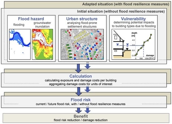 Flood events in the past few decades have shown an increasing intensity and have caused rising economic damage. Principal reasons for the ongoing process are the continuing urban development in flood-prone areas and climate change effects (e.g., [1,2,3,4]). They underline the further necessity to improve the resilience of urban areas by suitable flood prevention and flood damage mitigation concepts. In view of the widely used term resilience, it is understood—in the context of the paper—in an engineering perspective as the capacity of the built environment to cope with natural hazards, to prevent or mitigate losses as well as to recover easily and quickly from damaging effects following [5,6,7,8]. This is in line with the shift in flood risk management accepting that risks cannot be eliminated completely. Concepts to improve the urban resilience base on more integrative and sustainable approaches considering relevant functions of urban systems and their interactions [9,10,11,12]. In consequence, both research and legislation have been reinforcing a more holistic view on each part of the disaster management cycle to improve existing solutions and to develop new options reducing current and future flood risks, which also include environmental, societal and economic perspectives [11,13,14,15,16].