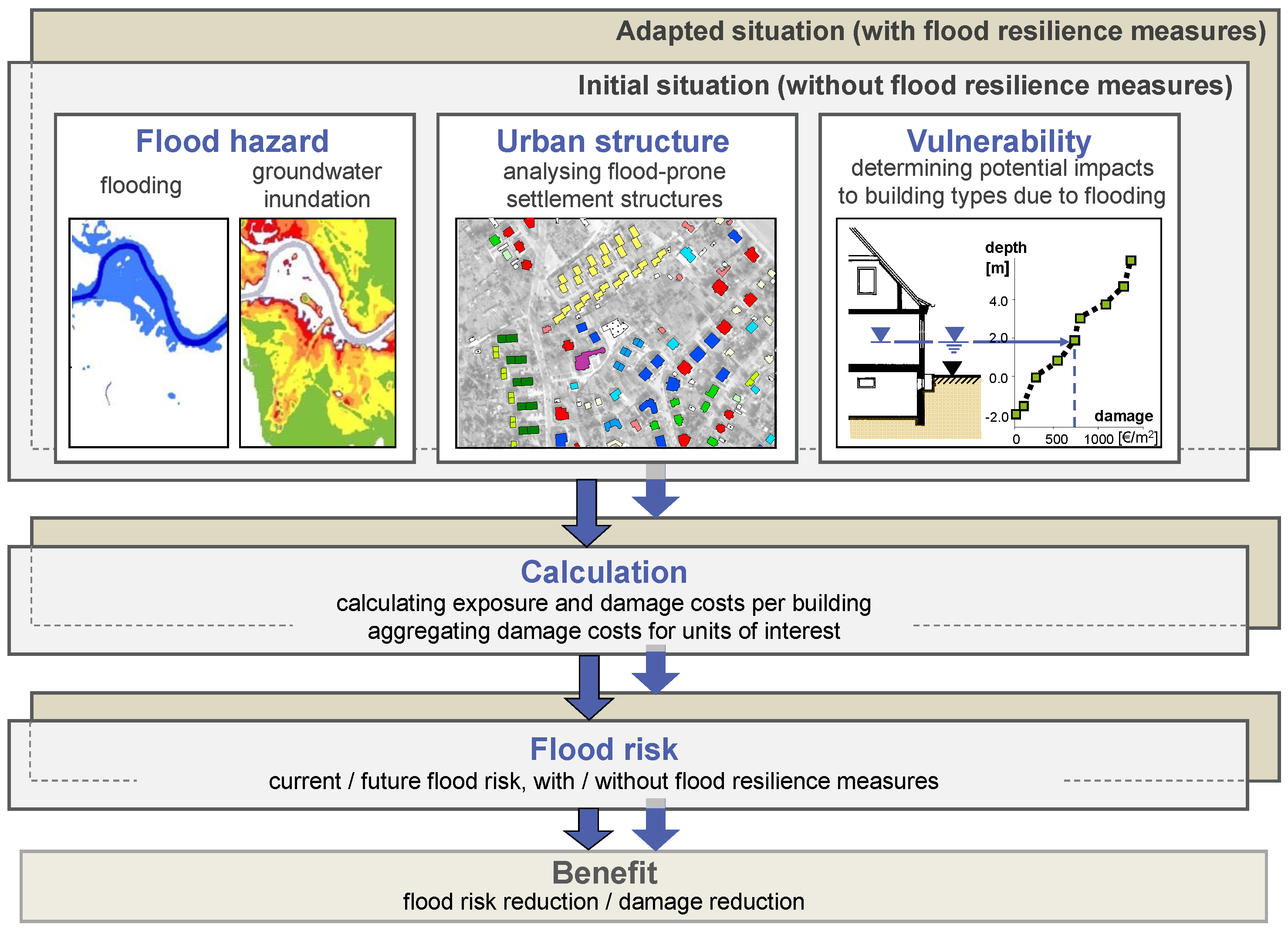 Building-related FReT can be viewed as a smart option to reduce flood damage to buildings and hence to improve the resilience of urban areas. Nevertheless, these potentialities have hardly been used up to now. This can be explained e.g., due to a lack of appropriate tools for both analysing FReT effects on building-scale and transferring these results into a spatial scale of interest. However, such tools are required (i) to improve the understanding of the FReT performance; (ii) to provide a sound foundation for decision-making; as well as (iii) to facilitate FReT implementation.