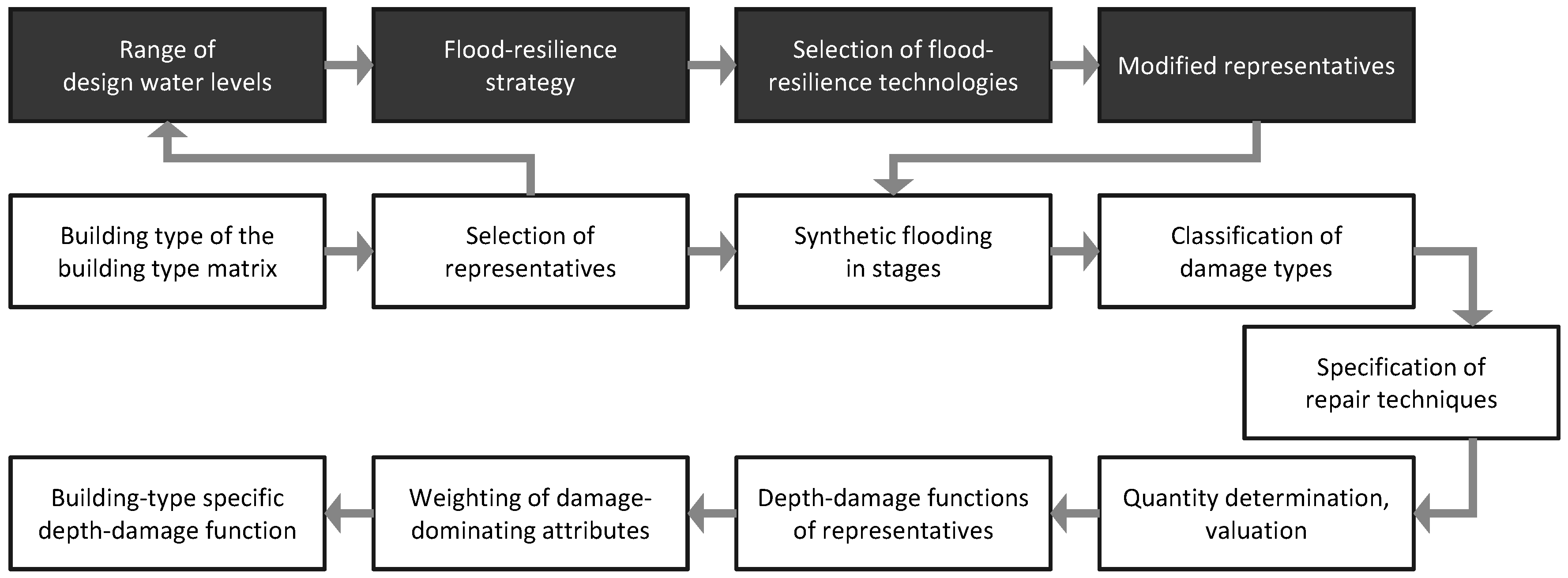 For every range of design water level, the building type representatives need appropriate concepts integrating FReT. The integration process follows the flood-resilience strategies—dry-proofing, wet-proofing, and avoidance, which are closely related to specific FReT. The selection and consideration of the specific measures in the vulnerability assessment are, like the whole procedure, embedded in a civil engineering planning process.