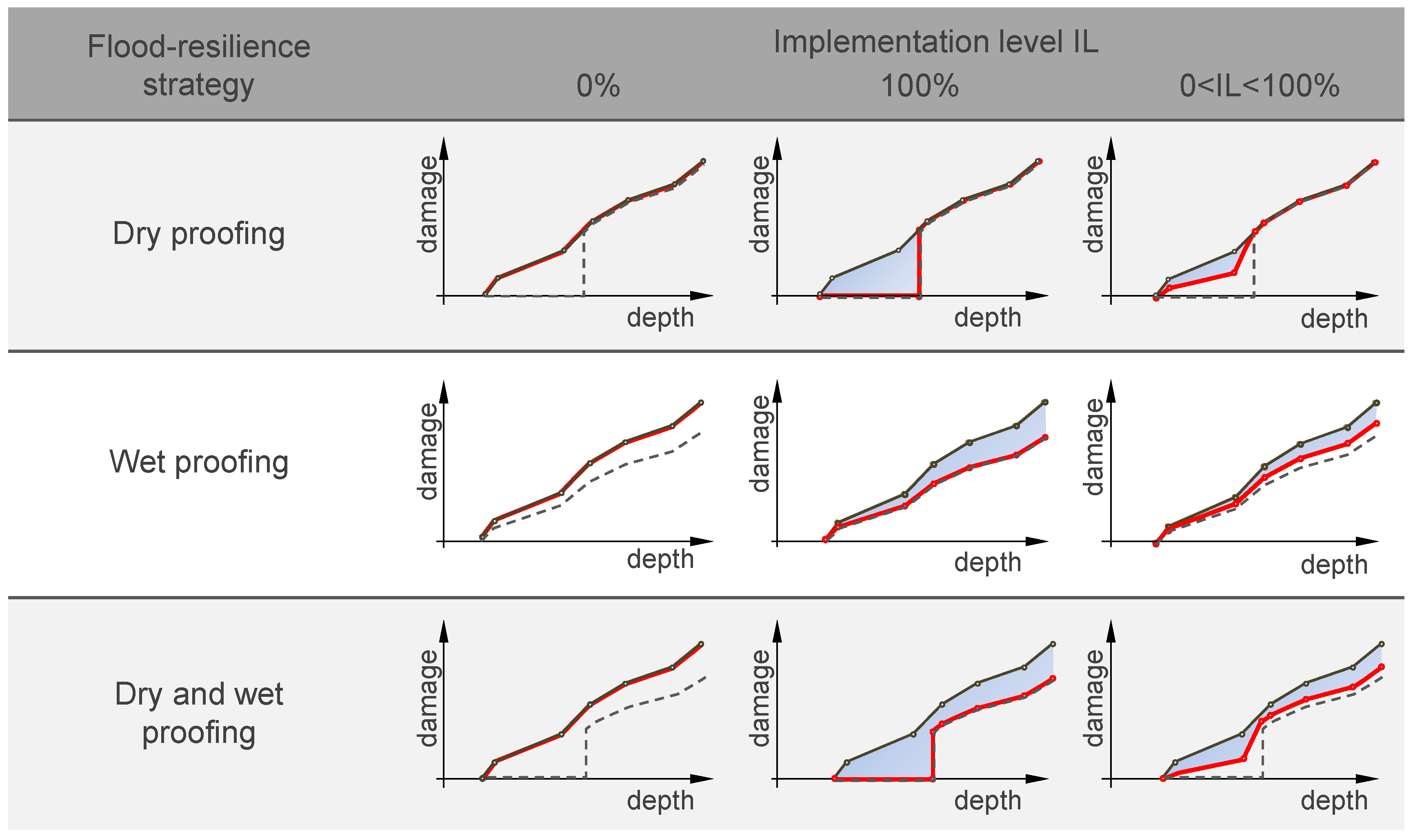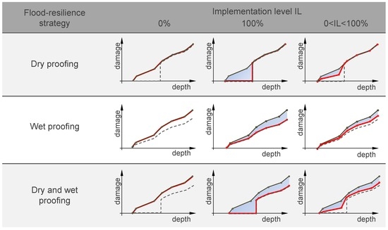 Qualitative effects of the implementation level (IL) as damage dominating attributes depending on selected flood-resilience strategies. Continuous red line: weighted function result; Continuous grey line: implementation level 0%; Dashed grey line: implementation level 100%; Light-blue area: reduced damage as the effect of flood-resilience technologies.
