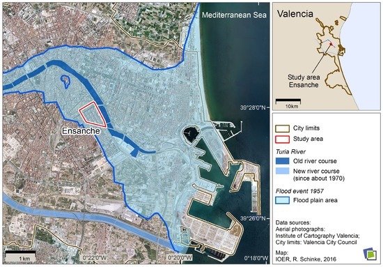 In view of the threats, one of the investigated study areas named Ensanche is close to the historic city centre and covers an area of about 39 hectares (0.39 km2). It is located on the old bank of the Turia River. Figure 4 shows the map of the city with the flood plain of the 1957 event and the study area Ensanche.