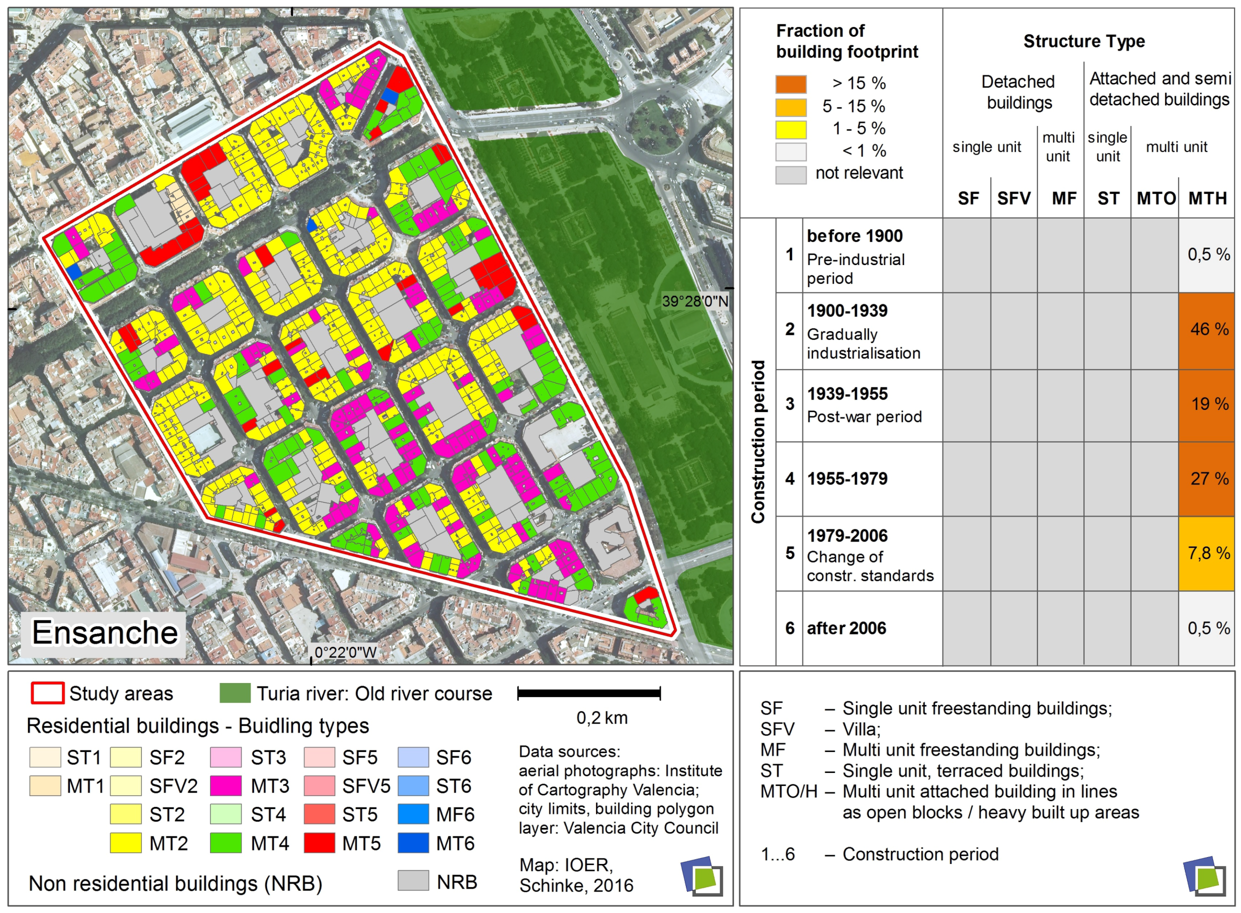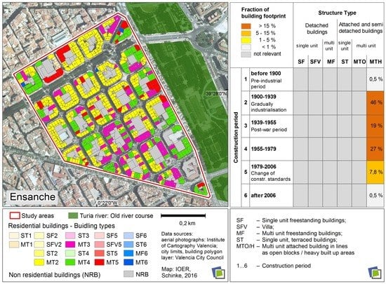 The characterisation of the urban area follows the building type approach. It needed a derivation of typical Spanish construction periods. These periods reflect the time-dependent, gradual development of the country considering political, architectural, and technical aspects. The derived construction periods and structure types generate the building type matrix as a basis to specify the urban structure in the Spanish study areas. The resulting building type matrix is comparable with findings of [40,41,42] that increase the connectivity of the research. The developed matrix for the residential buildings was the basis for analysing the settlement structure within the study areas. The detailed analysis with its site-specific outcomes is presented in Figure 5. It comprises the building type map for the study area Ensanche as well as the resulting building type matrix including the fraction of building footprints for every building type.