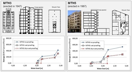 The wet proofing strategy reduces flood damage to buildings by a modification of building construction and building services. In Valencia, beam-column constructions are frequently used as supporting structures in multi-unit attached buildings (MTH/MTO). As a consequence of this, the ground floor is relatively free of load bearing walls and allows a flexible floor plan design. This is the reason why in the majority of cases the measures focus on wall and floor finish layers as well as on central elements of building services. The relocation of highly vulnerable and cost intensive elevator machinery is in this study an important point to reduce flood damage to buildings. The diagrams in Figure 6 present wet proofing effects for two examples (the building type representatives of MTH3 and MTH5), marked by black rectangles and black dashed lines. In addition, the combination of dry and wet proofing effects based on the selected and recommended FReT is shown (red points with red dashed line).