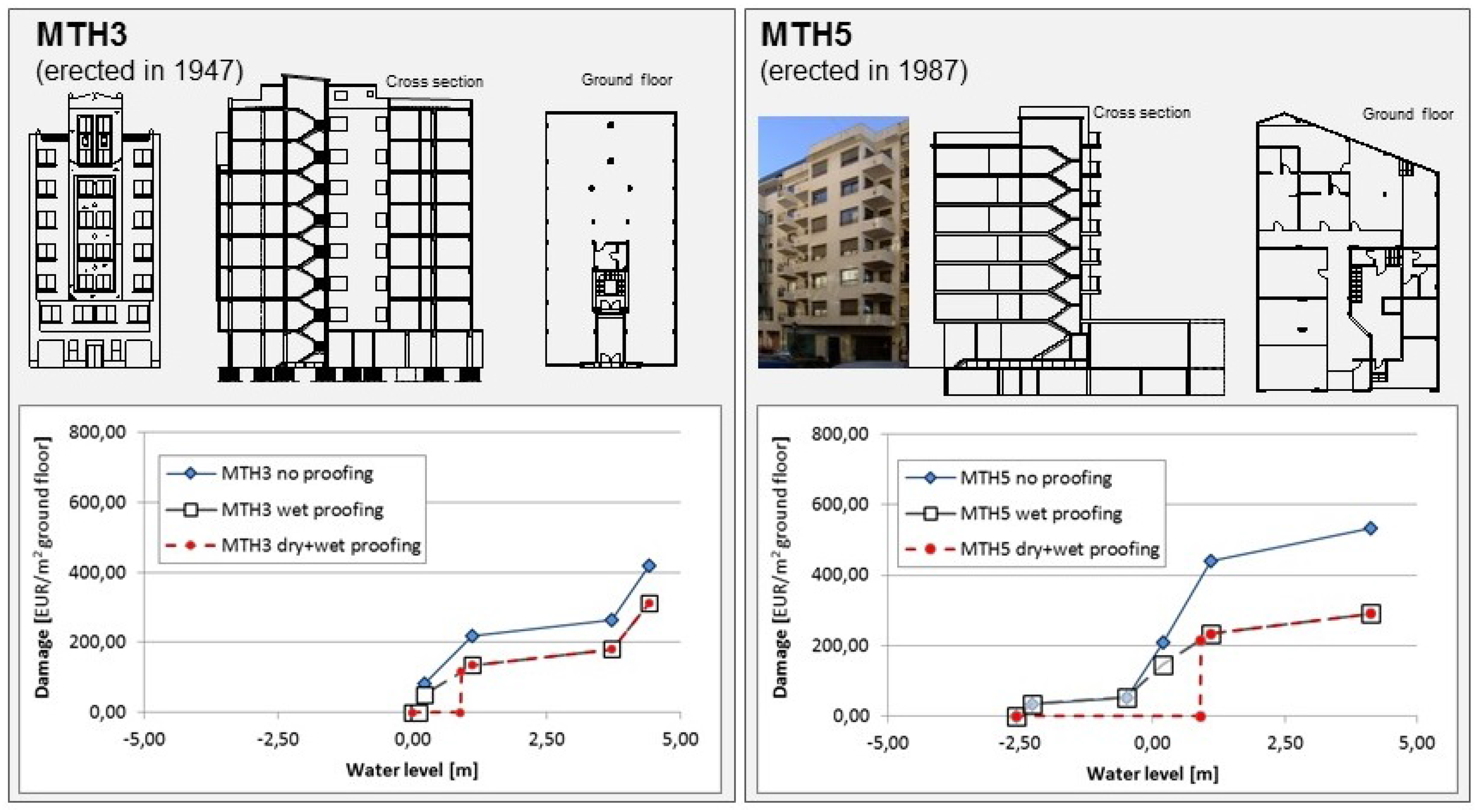 The derivation of site-specific depth-damage curves is based on the previously described extended synthetic method with a detailed analysis of characteristic, actually existing buildings surveyed in the study area, having regards to well-engineered solutions of FReT. The in-depth analysis of the building type representatives included intensive archive research and on-site inspections in order to identify, analyse, and describe the building characteristics regarding their structural design, building materials, and building services. The integration of the FReT effects follows additional methodical steps. Taking into account the characteristics of relevant building types, two ranges of design water levels were specified. The design water level up to 0.9 m refers to dry proofing strategy and values higher than 0.9 m refer to a combined strategy considering dry and wet proofing.