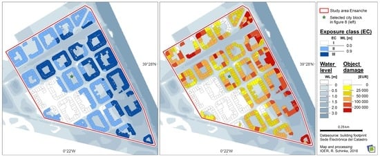 Furthermore, damage-relevant data will further reduce the uncertainty of synthetic depth-damage function. In the Valencia case, the land register offers such information like the object-related, lowest basement level [44]. It led to an adaptation of the functions regarding the variation of the basement levels. In Ensanche, this adaptation was possible because of the comparable ground floor height as well as the absence and/or a relative independent location of building service. With an extended nomenclature, the function could be allocated to the respective object within the damage model.