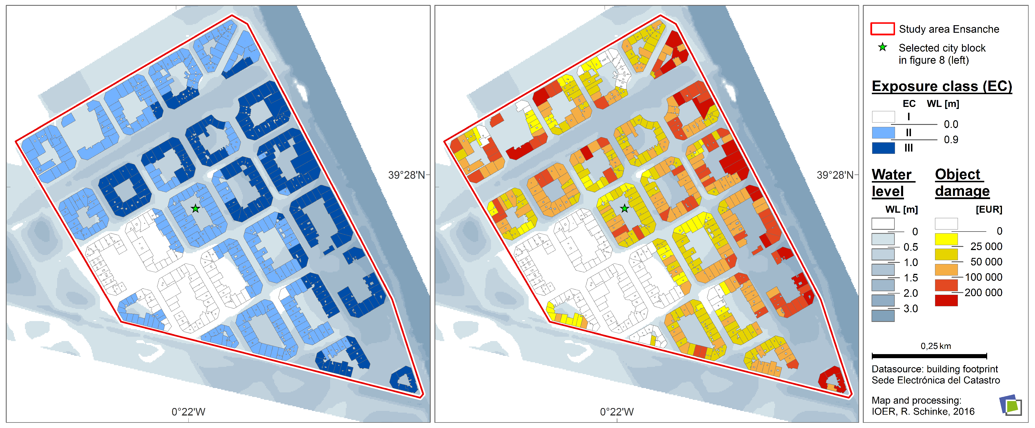 The applicability of the extended approach is demonstrated in the case study Valencia (Spain). Notwithstanding the crucial importance of flood hazards in damage modelling, its analysis was not part of the investigation. This is why the estimated flood water levels have a purely hypothetical character, and they serve only as boundary conditions and/or reference values. However, the research is targeted on built environment as receptor and on consequences of floods.