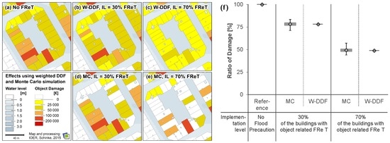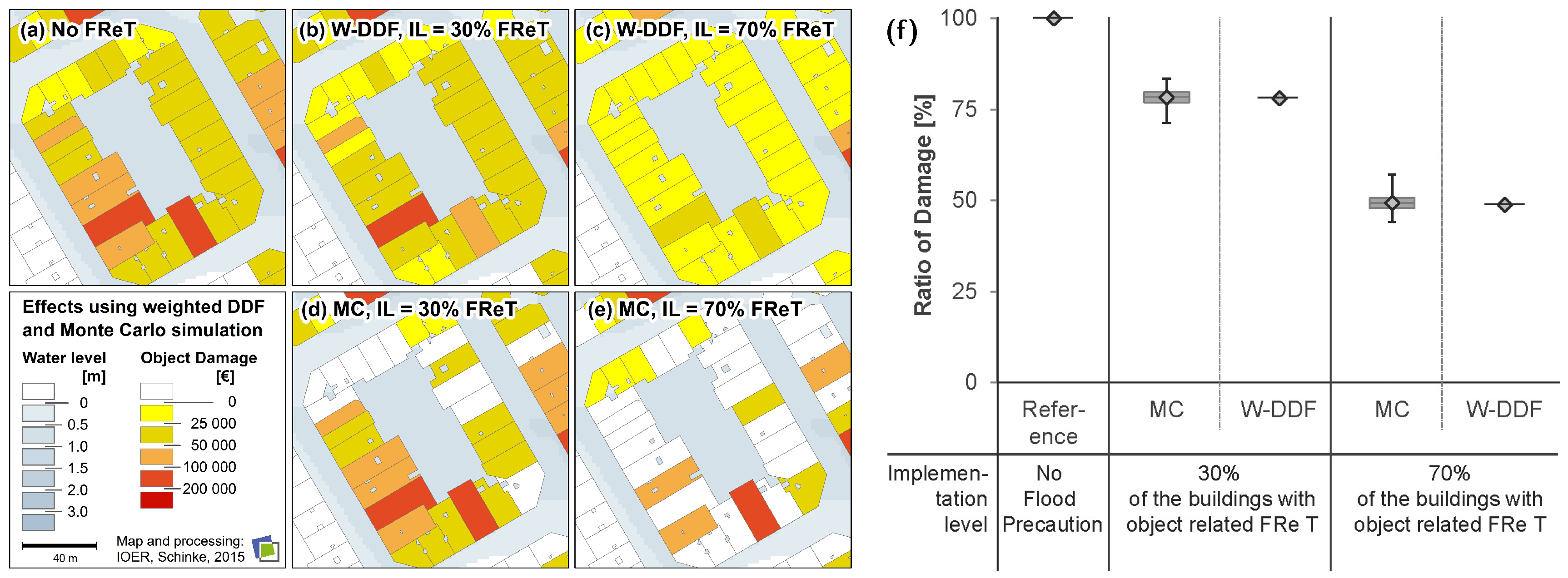 Comparison of the variant analysis using weighted depth-damage function (W-DDF) and Monte Carlo Simulation (MC). Left side: map with one quarter of exposure class II (a): reference situation; (b), (c): W-DDF; (d), (e): example of one model run (MC); Right side: (f) ratio of flood damage to residential buildings in the proofed state to the reference state for the whole case study area.