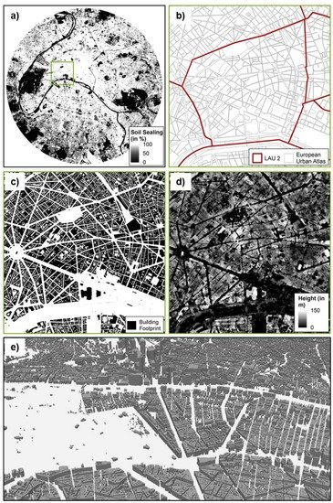 Spatial input data: (a) Soil Sealing Layer; (b) Block units of the European Urban Atlas and Local Administrative Units (LAU); (c) Building footprints from OSM (comparable to the building footprint of the UKMap dataset, respectively); (d) Normalized digital surface model from Cartosat-1 satellite data; and (e) Perspective view of the derived 3-D city model, exemplified for Paris.