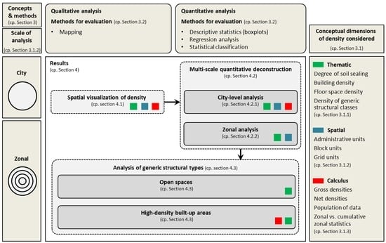 We introduce a framework for this study to deconstruct physical density of cities (Figure 2). It relates on the one hand to the Concept and Methods Section (Section 3.1 and Section 3.2, respectively). In this, various conceptual dimensions of physical urban density, i.e., the thematic (Section 3.1.1), the spatial (Section 3.1.2) and the calculative (Section 3.1.3) dimensions, are addressed and defined. Subsequent analyses of the derived density measures are categorized by means of qualitative or quantitative evaluation methods (Section 3.2). On the other hand, the framework relates to the Results Section (Section 4.1, Section 4.2 and Section 4.3). Map appearance (Section 4.1) and the quantitative deconstruction of the density measure are contrasted from non-site-specific (city scale) (Section 4.2.1) and site-specific (zonal model) (Section 4.2.2) perspectives. Ultimately, densities of generic structural types are evaluated by techniques of statistical classification, zonal statistics and by the visual impression from discrete mapping (Section 4.3).