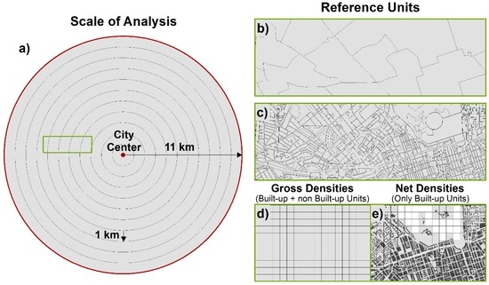 The physical configuration of a city is reflected in a hierarchy of different centers and sub centers or clusters across many scales, from the entire city region to neighborhoods [17]. This complex pattern of diverse, multiscale densities shows that an “objective scale” for the calculation of density is inexistent [4,45]. In this regard the modifiable area unit problem (MAUP) (e.g., [7]) produces a statistical bias by aggregation units that are arbitrary, modifiable, and subjective. We confront this issue by the introduction of a well-defined multiscale spatial concept to deconstruct the sensitivity of analytical results to the definition of the selected reference unit. To do so, we define the spatial dimensions based on the scale of analysis (Section 3.1.2.1) and various reference units (Section 3.1.2.2).