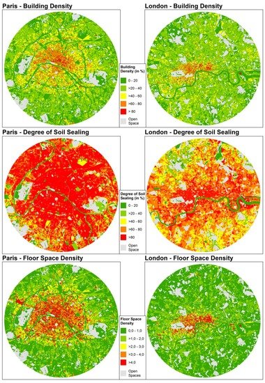 The cartographic visualization of density is a powerful tool in urban planning. However, when mapping densities, it becomes obvious that map appearances vary significantly with respect to the thematic dimension, the scale of analysis, the applied reference unit or the method of calculation. Figure 4 illustrates the variability of the density measures regarding building density, soil sealing and floor space density for the entire areas of investigation in Paris and London at block level.