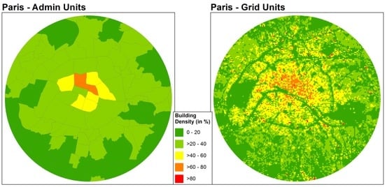 We exemplify the delusiveness of the density measure using a classical thematic variable in geography-population: Based on 2011 census data [6], the megacity Paris has a population density of 21,258 people per km2. London’s population density is, in contrast, only 5432 people per km2. While such contrasting realities are often used for comparing cities, in this case their usage neglects that these data are de-facto not comparable: the Paris example refers to an area of 105.4 km2, while the London case refers to a significantly larger reference area of 1572 km2, an issue commonly known as the modifiable areal unit problem (MAUP) [7]. Consequently, the arbitrariness of the two reference units affects results and triggers misleading interpretations with ineligible applications of the density measure. In this case, the inherent delineation issues that arise from the employment of artificial administrative city boundaries limit the density measure to a simple rhetorical medium that is prone to misconception. Such conceptual issues implicitly introduce the complexity that comes along with its usage and explain why an internationally accepted standard for the density measure is yet inexistent [5,8].