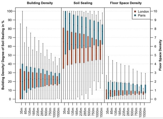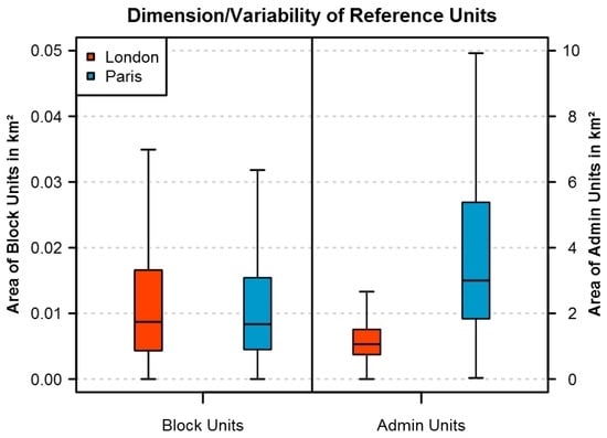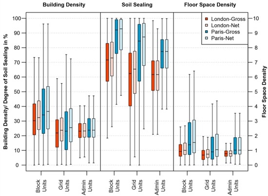 Figure 6 allows the following conclusions: (1) Naturally, net densities are consistently higher than gross densities. Consequently, the application of either of the measures has influence on the absolute values of density measured. The differences vary between 0% and 4%. Thus, whenever used for cross-city comparisons the specification of the measurement of density is imperative. (2) Per definition, soil sealing density values are significantly higher than building density values. It is interesting to note, that for the specific cases of Paris and London, the cross-city differences in soil sealing values are significantly higher (in the range of 20% depending on the reference unit) than for building density (in the range of 4%). (3) The administrative units result in the comparably lowest density values. In contrast, the block units reveal the highest values. The assumption suggests that this is due to the larger sizes of administrative units. However, as Figure 7 contrasts the dimensions and variabilities of block and administrative units, this assumption is only partly true. Indeed, the administrative units for Paris are significantly larger than the block and the used standard grid units. For London, the opposite case of smaller LAU-2 units is given. Although the spatial dimension of grid and block units is similar, their difference in spatial form reduces the density values for grid units by a range of 10%. This can be explained by the spatially unspecific form and location of grids neglecting the real urban physical configuration (which is supposed to be better in block units). (4) Geographically the results clearly reveal that at city level Paris is denser than London, both in terms of the observed medians and the peak values. This holds true for the thematic dimension of the parameters building density, soil sealing as well as the floor space density. It holds true for both net and gross densities across all three reference units applied. Furthermore, the variance of density values is commonly higher in Paris—with soil sealing densities as the only exception.