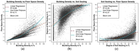 (a) Floor space density as function of building density; (b) Soil sealing as function of building density; and (c) Floor space density as function of soil sealing; all examples are presented at block level using gross densities for Paris.