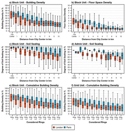 Gradient analysis for three thematic dimensions illustrated by site-specific boxplots on: (a) building density; (b) floor space density; and (c) soil sealing at block level for London and Paris. (d) For one example, soil sealing, the gradient analysis is presented at administrative units. For two other examples, using building density, the cumulative gradient analysis is illustrated for: (e) block units; and (f) grid units.