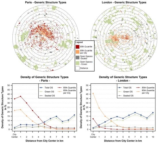 The following conclusions can be drawn from Figure 11: Regarding the generic structural class highest built-up densities, the applied statistical approach drawing from the global population of data for both cities allows for a direct approach comparing cities. While the analyses above reveal that built-up density of Paris is significantly higher, this type of analysis emphasizes this result. The share of these areas is in Paris with 5.91% of the entire study area significantly higher than for London, where it amounts only 0.25%. In Paris, this specific generic structural type is dominant within the Boulevard Périphérique and covers a large share of the inner city. In London, this class is only slightly represented in the central parts north of river Thames. In absolute numbers the difference in density between both cities based on this specific structural type becomes even clearer: with 22.5 km2 we identify 23 times as much in extent for Paris (2670 blocks) than for London (0.95 km2; 221 blocks). Regarding zonal statistics, it becomes obvious that the urban mass concentration in the center of Paris is significantly higher and covers larger spatial extents than in London. When changing the applied statistical approach by drawing from the population of data for one city at a time, the results are reversed. The share of areas in London is then with 3.12% of the area of interest higher than for Paris (2.63%). With 11.86 km2, it is larger than that of Paris (9.98 km2). The analysis reveals that London also has—compared to the surrounding urban morphology—a distinct urban mass concentration in the city center. This particular result reveals the methodological and analytical fuzziness of the density measure. It shows that varying calculation methods may lead to contradictory results. It shows that the spatio-structural manifestation of density always needs to be seen in a relative manner.