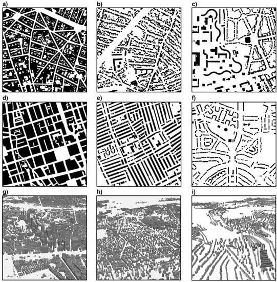 Ground figure plans for characteristic generic structural types: High building density for (a) Paris and (d) London; Medium building density for (b) Paris and (e) London; Low building density for (c) Paris and (f) London; (g) High floor space density and (h) medium density housing development in Paris; and (i) row house structures in suburbs (Purley) of London.
