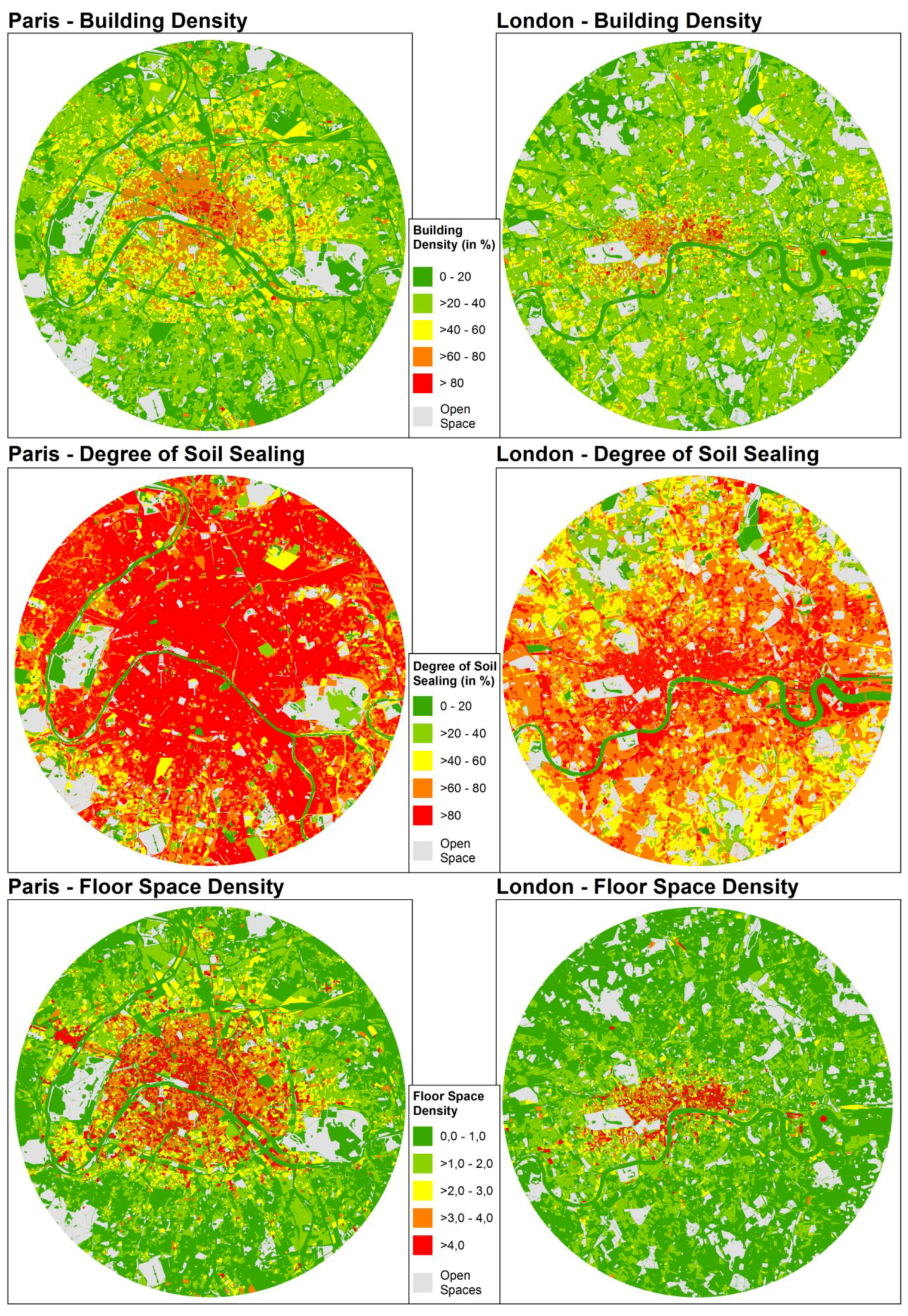 Soil sealing densities show a partly different spatial pattern. Similar to building densities, high soil sealing densities are mapped for the urban centers. However, the decrease in soil sealing with rising distance to the urban center is by far less distinct. In Paris the decrease of soil sealing even outside the Boulevard Périphérique is marginal. For London, areas of high soil sealing comprise a significantly larger area than high building densities; however, the decrease to the peripheral areas is apparent.