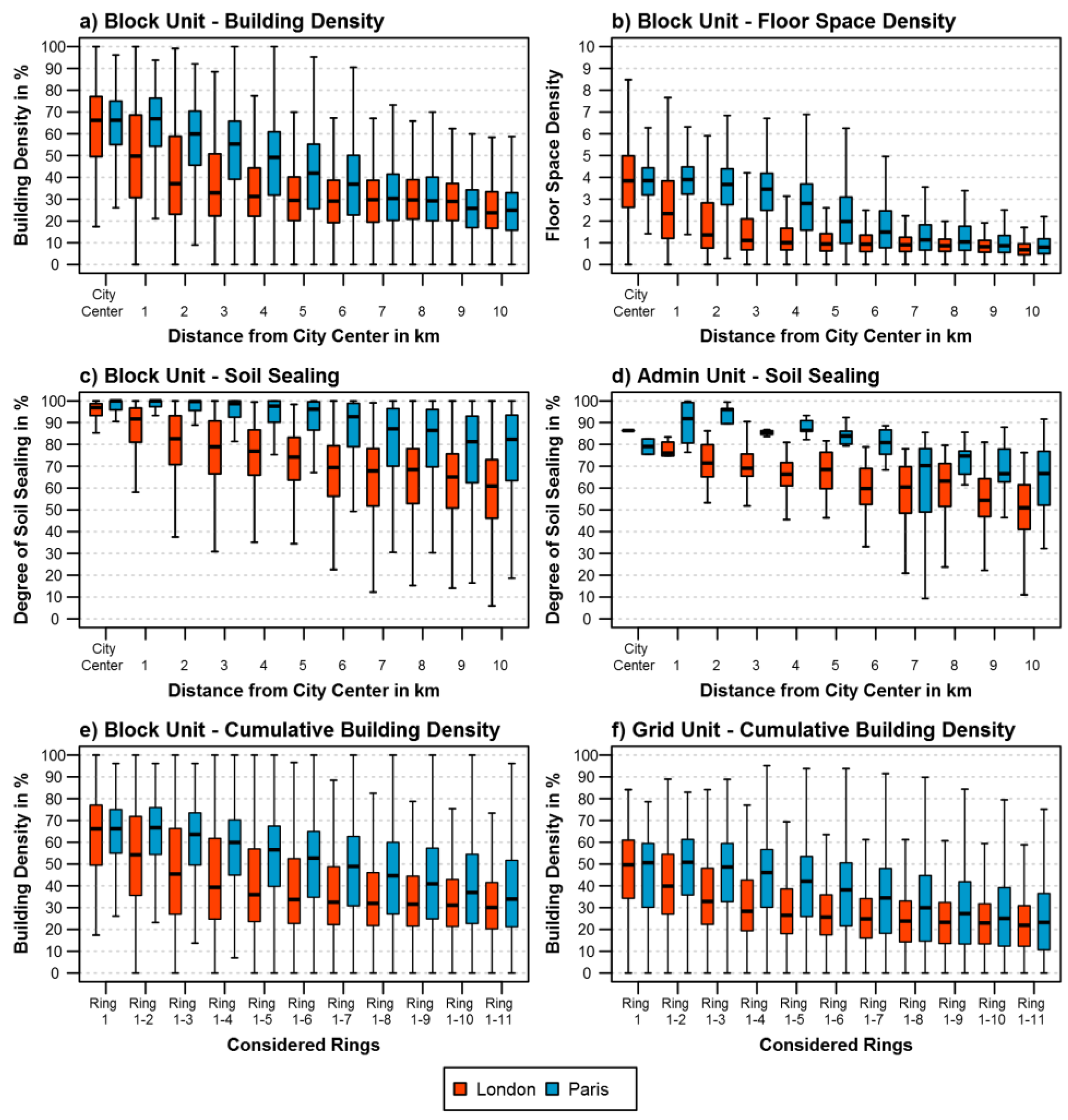 Figure 6 allows the following conclusions: (1) Naturally, net densities are consistently higher than gross densities. Consequently, the application of either of the measures has influence on the absolute values of density measured. The differences vary between 0% and 4%. Thus, whenever used for cross-city comparisons the specification of the measurement of density is imperative. (2) Per definition, soil sealing density values are significantly higher than building density values. It is interesting to note, that for the specific cases of Paris and London, the cross-city differences in soil sealing values are significantly higher (in the range of 20% depending on the reference unit) than for building density (in the range of 4%). (3) The administrative units result in the comparably lowest density values. In contrast, the block units reveal the highest values. The assumption suggests that this is due to the larger sizes of administrative units. However, as