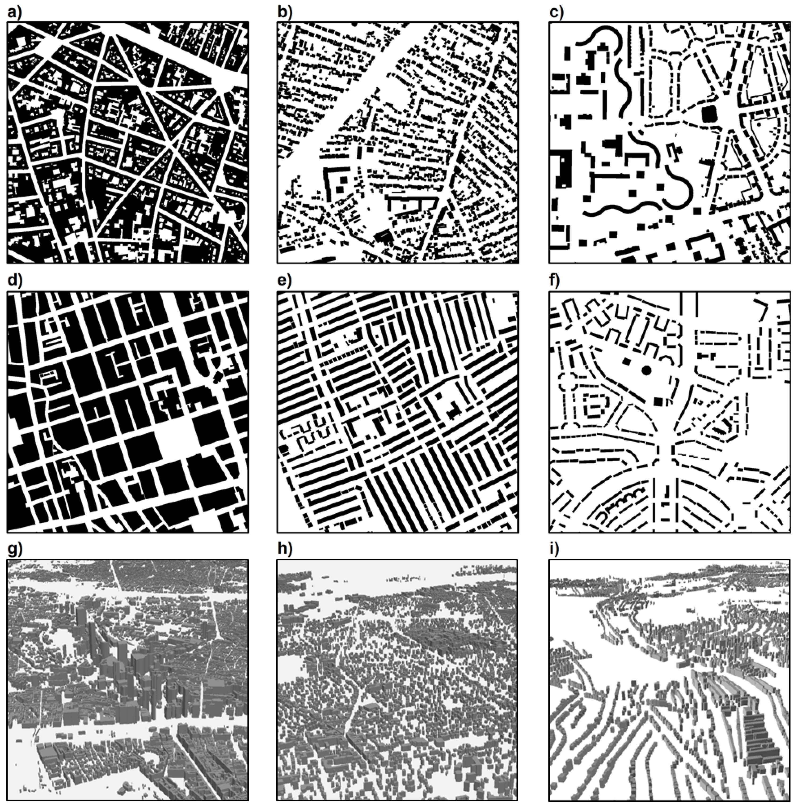 Figure 12 exemplifies three generic structural types per city: highest building density, average building density and low building density and gives perspective views on these three structural types using the 3-D city models.