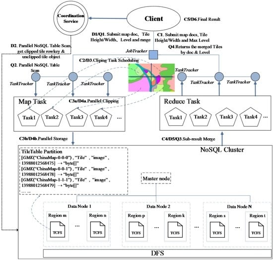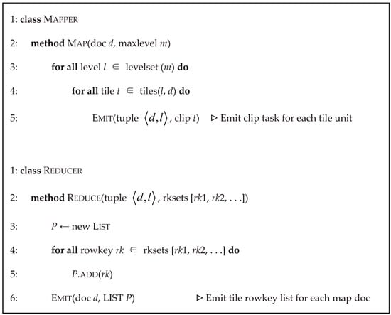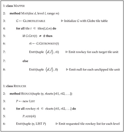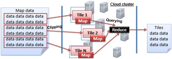 Figure 13), primarily implemented by means of the MapReduce computing paradigm, yields the parallel retrieval of tile objects in our NoSQL tile storage model. The input of this algorithm is the query condition collection