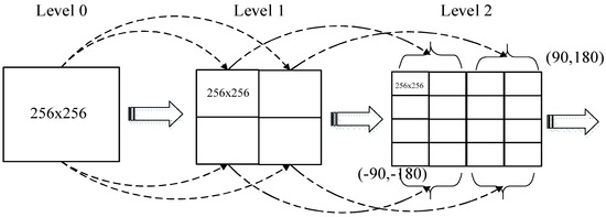 col denote the row coordinate and column coordinate of the corresponding tile in the current level, respectively. Obviously, the N-level (N > 0) tile layer is the successive result clipped from the N-1 tile level. For instance, tile level 1 is the further clipped result of level 0; the rows and columns of level 0, bisected in half, result in a total of four tiles, and the row coordinates and column coordinates can simply be numbered from 0 to 1. After that, the upper left corner of the tile map can be identified by tile triple {1, 0, 0}. Likewise, level-2 tile generation is based on level-1 tiles, and each tile will be equally divided into four portions, namely, rows and columns were dissected into four equal portions, resulting in a total of 16 tiles. Then, the q-level tile map can have its rows and columns divided equally into 2