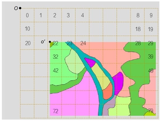 O for the global map grid. Here, we set the geographic coordinate of the upper left corner of China’s geographic scope to be the origin of the global grid, and we also specify the display ratio for each level and the height and width of the tile unit. Then, both the size of the grid of each specific level and the row and column number covered by the global grid can be determined. The sub-map region in