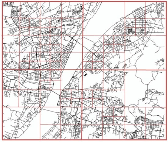 Figure 1, a vector dataset can be organized into multi-level maps using a quadtree recursive subdivision strategy. Then, each tile (represented by one rectangular block) of one specific level can be clipped and rendered into one picture as a part of the tile map. For a given map tile data, we can use the triple T = {