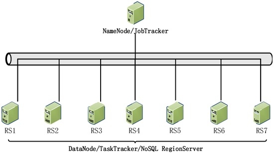 Figure 14; it is mainly composed of a tile data cluster with 8 NoSQL servers, where data nodes are connected with each other via Gigabit Ethernet. Each computation end is configured with one 2.8-GHz Dual-Core Intel processor, 4 GB of 1066-MHz DDR3 ECC memory and 1 TB of disk storage, running the CentOS Linux 5.8 64-bit operating system. One of these NoSQL nodes is used as a distributed tile storage controller and task scheduler (i.e.,