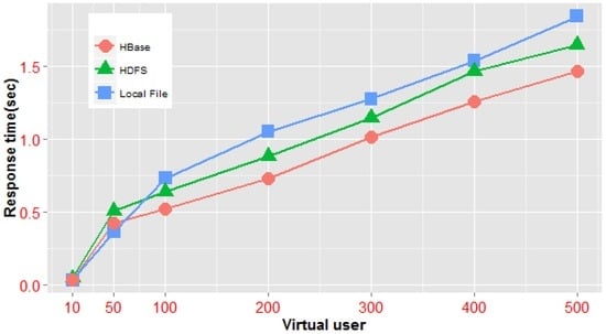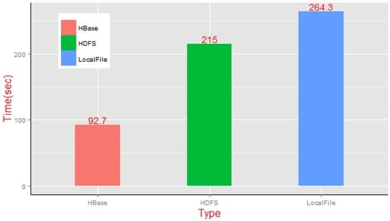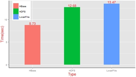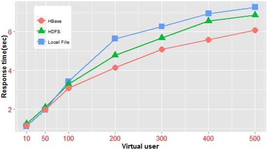 The first experiment compared the tile data access performance of the standalone file cache-based method, the distributed file system (Hadoop HDFS)-based method and our proposed NoSQL-based management framework for tile map dataset processing.