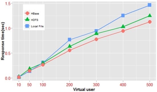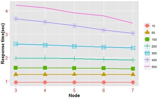Figure 19); as we can see, when the number of concurrent sessions is less than 100, the average response time of a query is not significantly affected by the increase of the node members. However, when the number of virtual users reaches 100, the more nodes we have participating in the processing, the faster our framework responds to the query. In the scenarios of small-scale concurrent query tasks, the effect of improving the processing efficiency by increasing the number of NoSQL nodes is not apparent; the reason for this is that the parallel acceleration gained by increasing the processing nodes is partly offset by the concurrently increased cost of network communication. When the scale of the concurrent query grows to a particular threshold (e.g., 200 users in