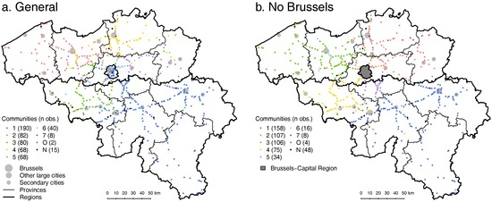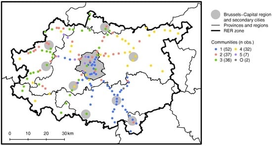 - Van Hecke, E.; Thomas, I.; Beelen, M.; Halleux, J.M.; Lambotte, J.M.; Rixhon, G.; Verhetsel, A. Le Mouvement Pendulaire en Belgique; Technical Report, Monographie de L’enquète Socio-Économique 2001; SPF Economie: Brussels, Belgium, 2009.