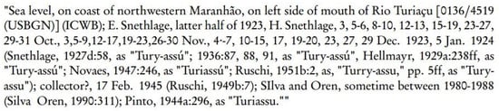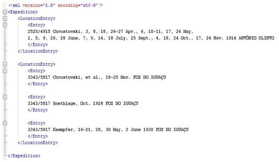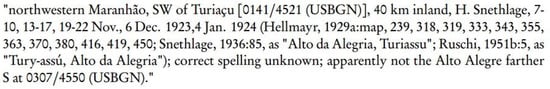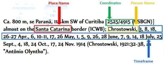 Approximately 80% of all the world’s information is stored as unstructured textual documents, and 85% of this has spatiotemporal traces []. Consequently, a high demand exists for methods to structure and extract such contents. For instance, the Brazilian Ornithological Gazetteer [,]—the corpus that we use for this research project—identifies approximately 6000 Brazilian sites where birds were observed or collected (this paper focuses particularly on three expeditions in the years 1910–1926). Reading the text does not fully satisfy the need to visualize the undertaken historic expedition from a spatiotemporal perspective, because it is full of entities such as people’s names, place names, institute names, and spatial and temporal markers described by natural language (see Figure 1). A deepened spatiotemporal understanding can help to make actual timing or location of events explicit, or otherwise, can possibly help to restrict time/place options.