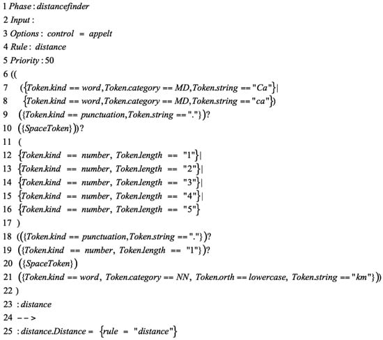 The following is an example of a JAPE rule that identifies a distance represented by a combination of word, number and punctuation tokens, such as “ca. 45.1 km”. Here, “ca.” means approximately (see Figure 3).