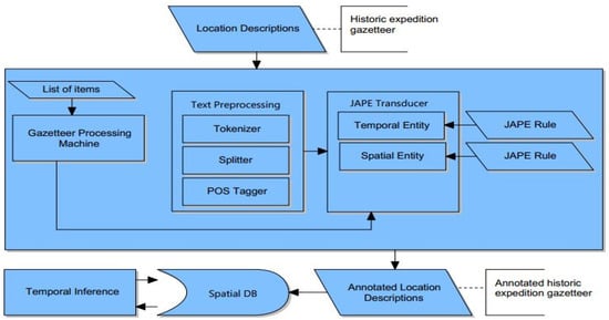Much research has been carried out to extract geospatial information from different text contents, such as web queries, micro-text messages, metadata and Wikipedia entries [,,,,], and some research [] has been conducted on retrieving temporal information from text documents. Our effort focuses on introducing geospatial or temporal information extraction methods from relatively structured text contents. However, a significant challenge remained in bridging the semantic gap between structured geospatial data as held in a GIS and hard-to-analyze spatial information, expressed in natural language []. The study in [] uses a natural language information processing platform called GATE (General Architecture for Text Engineering) to extract geographical named entities and associated spatial relations in natural language, based on syntactical rules from a large-scale annotated corpus. The study in [] introduced self-annotation as a new supervised learning approach for developing and implementing a system that extracts fine-grained relations between entities (such as geospatial relations). The main benefit of self-annotation is that it does not need manual labeling. Studies have been conducted to extract both spatial and temporal information from documents. For instance, Strötgen et al. [] present an approach that combines the Temporal Information Retrieval (TIR) and Geographic Information Retrieval (GIR) domains in the context of document exploration and information extraction tasks. In addition, our framework focuses on extracting spatiotemporal (geospatial and temporal) information from historic expedition gazetteers.
