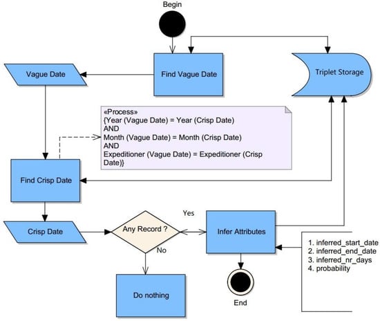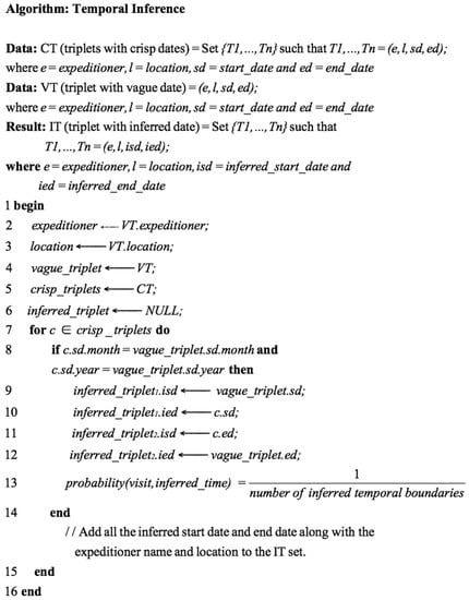In the context of this article, temporal inference is defined as a process of interpolating a relative temporal boundary. The result is a set of temporal scenarios for the extracted vague triplets. The temporal inference process, as depicted in Figure 10, entertains two-way communications with the spatial database to fetch crisp reference triplets and store the inferred ones. This process interpolates alternative timeframes and determines the probability of a given location visit to occur within the inferred timeframes. For instance, assume an expeditioner visited three sites (X, Y and Z) within a month. Assume he visited site X and Y with crisp temporal boundaries of 5–21 January 1921 and 25–31 January 1921, respectively. Additionally, he visited site Z with a vague temporal boundary (January 1921). The third visit must have been started and ended between 1 and 5 January 1921, or 21 and 25 January 1921. However, in the case of our framework, the default start and end dates assigned by the JAPE transducer for the timeframe January 1921 are 1921/01/01 and 1921/01/31, respectively, but after running the temporal inference algorithm (see Figure 11), the start and end dates will be two scenarios, A: (1921/01/01–1921/01/05) and B: (1921/01/21–1921/01/25). However, these inferred triplets can be refined by considering their distance to the crisp visits. The more realistic inferences would be those close to one of the crisp triplets. Moreover, in cases where the inferred triplets are equally distant from the crisp triplets, one can associate a probabilistic value to the inferred triplets.