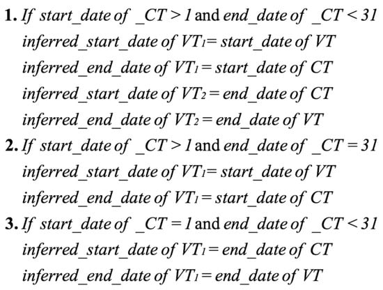 - Line 8–14 (see Figure 11): Let the vague triplet be VT and the crisp triplet be CT. If the month and year of the VT and CT are similar, for every given VT, a minimum of one or maximum of two temporal boundaries are inferred. If the given CT starts at the first day of the month or ends at the last day of the month, only one temporal boundary is inferred. If the given CT starts and ends between the first and last days of the month, two temporal boundaries are inferred. Given the VT and CT, the following holds (see Figure 12).