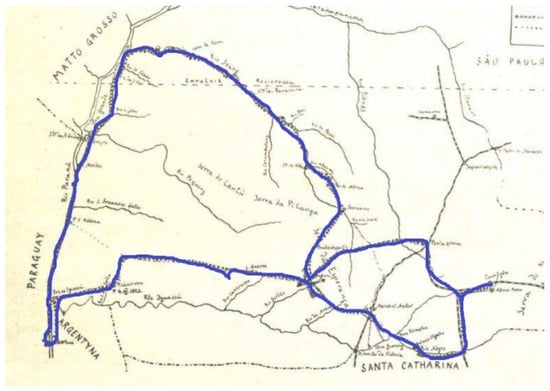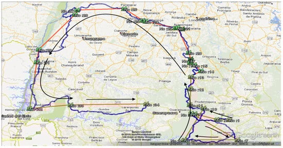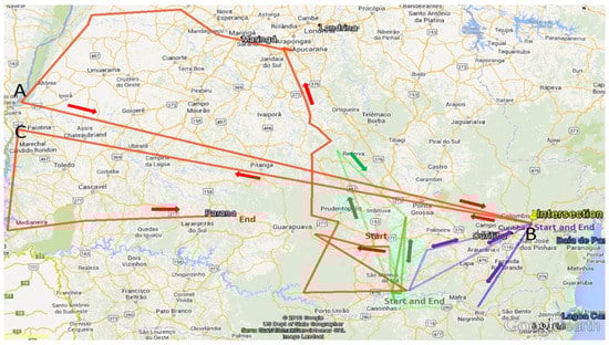 Straube and Urben-Filho mention that Chrostowski’s third expedition was carried out from 1921–1923 []. We used the expedition gazetteer texts that mentioned his name to experiment on our spatiotemporal information extraction framework. Accordingly, we managed to extract the spatial and temporal elements from the given text and created spatial features represented by the point data type using the extracted spatiotemporal information, and then we mapped the trajectory of the expedition route by connecting the extracted points chronologically. According to the extracted information, this expedition consists of 39 (see Table 4) site visits, out of which only 35 were identified as distinct site visits, meaning the remaining four visits were made to identical locations at different times (see the purple, blue and green colored records in Table 4), or these visits might have been mislabeled.