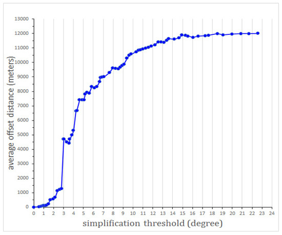 The threshold types of the four simplification algorithms are vertical distance, area, angle, and radius. We obtained five thresholds for each of the simplification algorithms with the five map scales, as shown in Table 2. We did not get accurate threshold values for the Angle algorithms at 1:5 M and 1:10 M map scale. With further analysis based on the average offset distance, a curve of the average offset distance varying with threshold is shown in Figure 5. According to Table 1, the values of Dground at 1:5 M and 1:10 M are 1411 m and 2822 m, respectively, but the jump from 1265 m to 4714 m in average offset distance happened between 2.8 degrees and 3.0 degrees, respectively, which resulted in the failure of us getting the appropriate threshold values at the 1:5 M and 1:10 M scale. This might be raised by the experimental data, in which the angle of most triangles enclosed by adjacent points was around 2.8 degree.