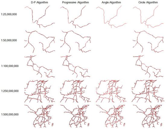 The experiment data was 1:1,000,000 railway data of China from the 1980s, which has 504 polyline features. The number of point coordinates of the data is 7296. Four algorithms: D-P algorithm, Progressive algorithm, Angle algorithm, and Circle algorithm were implemented in Python language with open source GDAL (Geospatial Data Abstraction Library) library. Five map scales were selected in the experiment. They were 1:2,500,000, 1:5,000,000, 1:10,000,000, 1:25,000,000, and 1:50,000,000. The size of computer display was 19 inches with . With Formulas (1) and (2), the PPI of the screen was 90 and the physical length of pixel was 0.2822 mm. We defined the distance between the human eye and the screen as being 600 mm in the experiment. Thus, the minimum distance that the human eye was able to distinguish was 0.1746 mm in terms of Formula (4), and the corresponding number of pixels was 1 in terms of Formula (5). Therefore, we obtained five ground distances (Dground), as shown in Table 1, which are respectively associated with the five designated map scales.