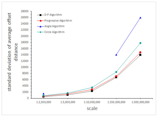 Figure 7 shows the result of standard deviation of average offset distance. The D-P algorithm, Progressive algorithm, and Circle algorithm perform well on the standard deviation of average offset distance. They do not have obvious differences when compared with the value of Dground in Table 1. The standard deviation of average offset distance for the D-P algorithm is lowest. The standard deviation of average offset distance on the Angle algorithm is the highest, especially when the map scale is getting small. It reveals that there are some simplified line segments which become far away from the original ones when using the Angle algorithm, as shown in Figure 8 with the green line circled.